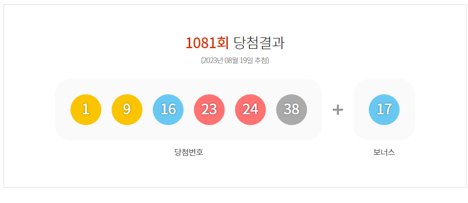 이번 1081회 로또 당첨번호는 1, 9, 16, 23, 24, 38 (보너스 17) 입니다.