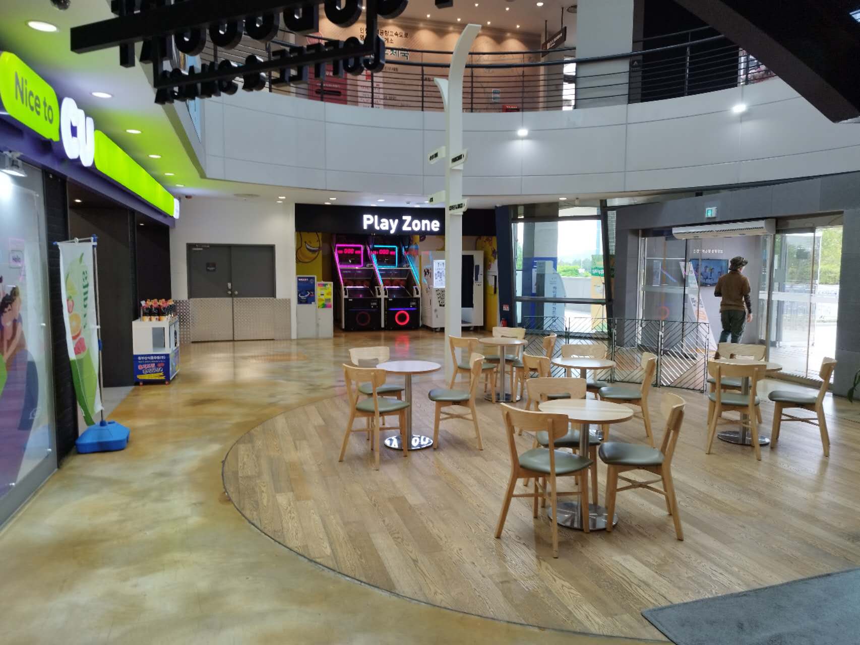 CU편의점과 앞에 앉아서 먹을 수 있는 공간이 마련되어 있습니다.