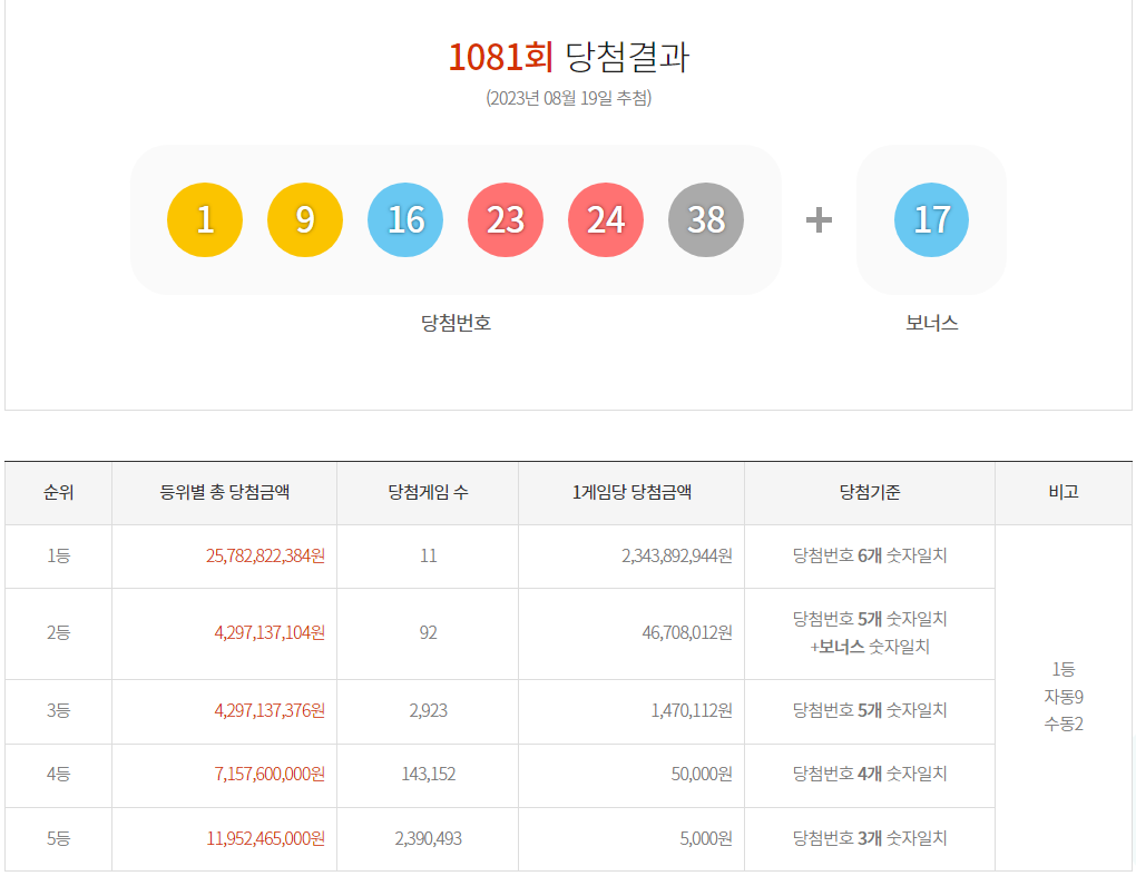지난 1081회 로또 당첨번호는 1, 9, 16, 23, 24, 38 (보너스 17) 이었네요