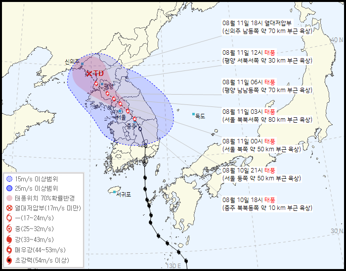 8월 10일 자정 전후, 태풍은 수도권을 지나갈 것으로 예상되고,